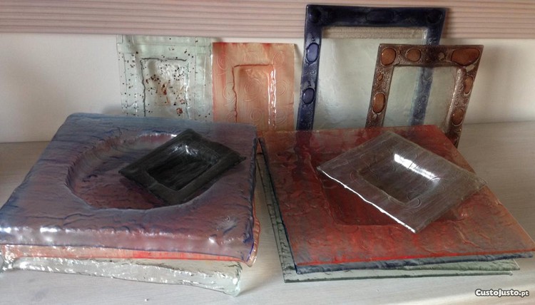 Vários pratos de vidro de fabrico artesanal, novos, diferentes tamanhos e modelos.