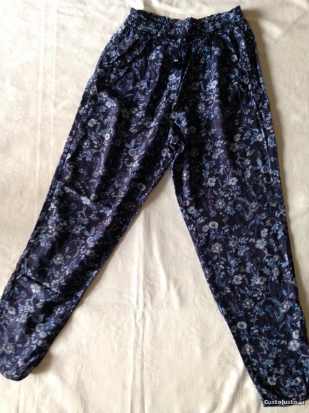 Calças Joggers em tecido macio , azul marinho/floral, com laço decorativo e elástico forrado na cintura. Bolsos laterais.