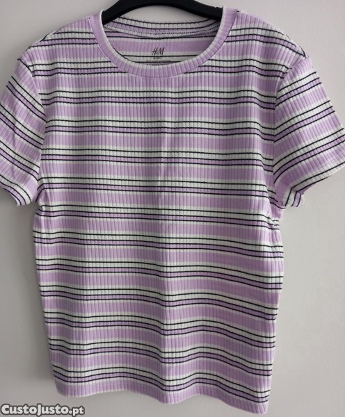 Camisola manga curta cor lilás clarinho com riscas de cor preta e branca.