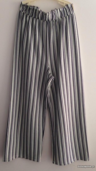 Calças pelo tornozelo em tecido fresco (62% poliéster, 33% viscose e 5% elastano) com pernas largas e retas. Cintura elástica com pequena orla de folho .