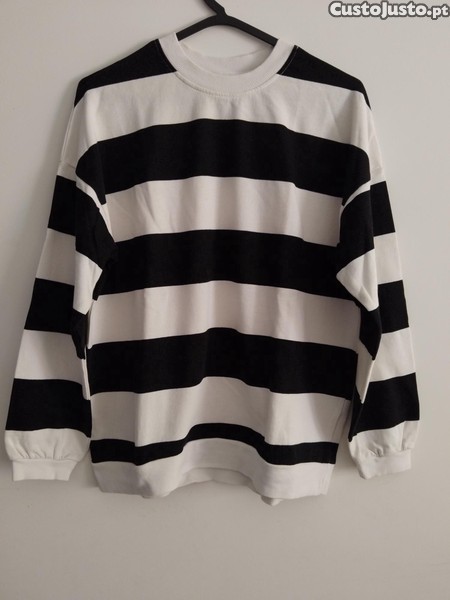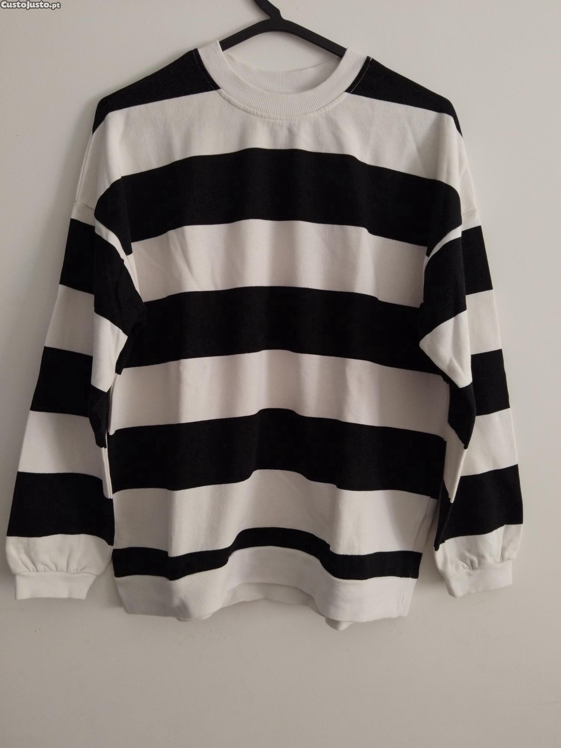 Sweatshirt H&M com padrão de riscas pretas e brancas. Gola redonda e mangas compridas. Acabamento canelado nos punhos e na bainha.