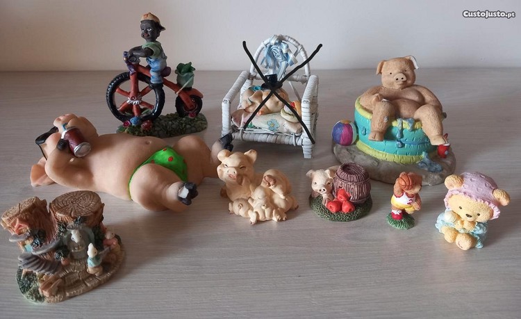 5 miniaturas de porcos, 1 menino negro a andar de bicicleta, 1 ursinho jogador de basquete, 1 ursinho bebé com gorro com um guizo na ponta e uma miniatura com coelhinhos.