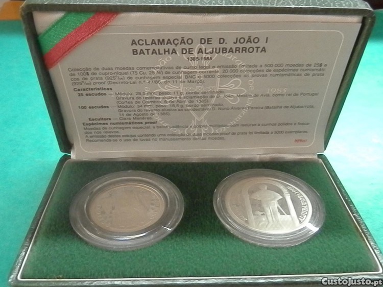 - PROOF: Estojo com 2 moedas prata Proof (25$00 e 100$00) 1985, com certificado (não tem cinta exterior), comemorativas D. João I e Aljubarrota. Valor final de 55,00 euros com envio em correio registado de minha conta. Valor final de 55,00 euros - preço fixo - material das fotos.