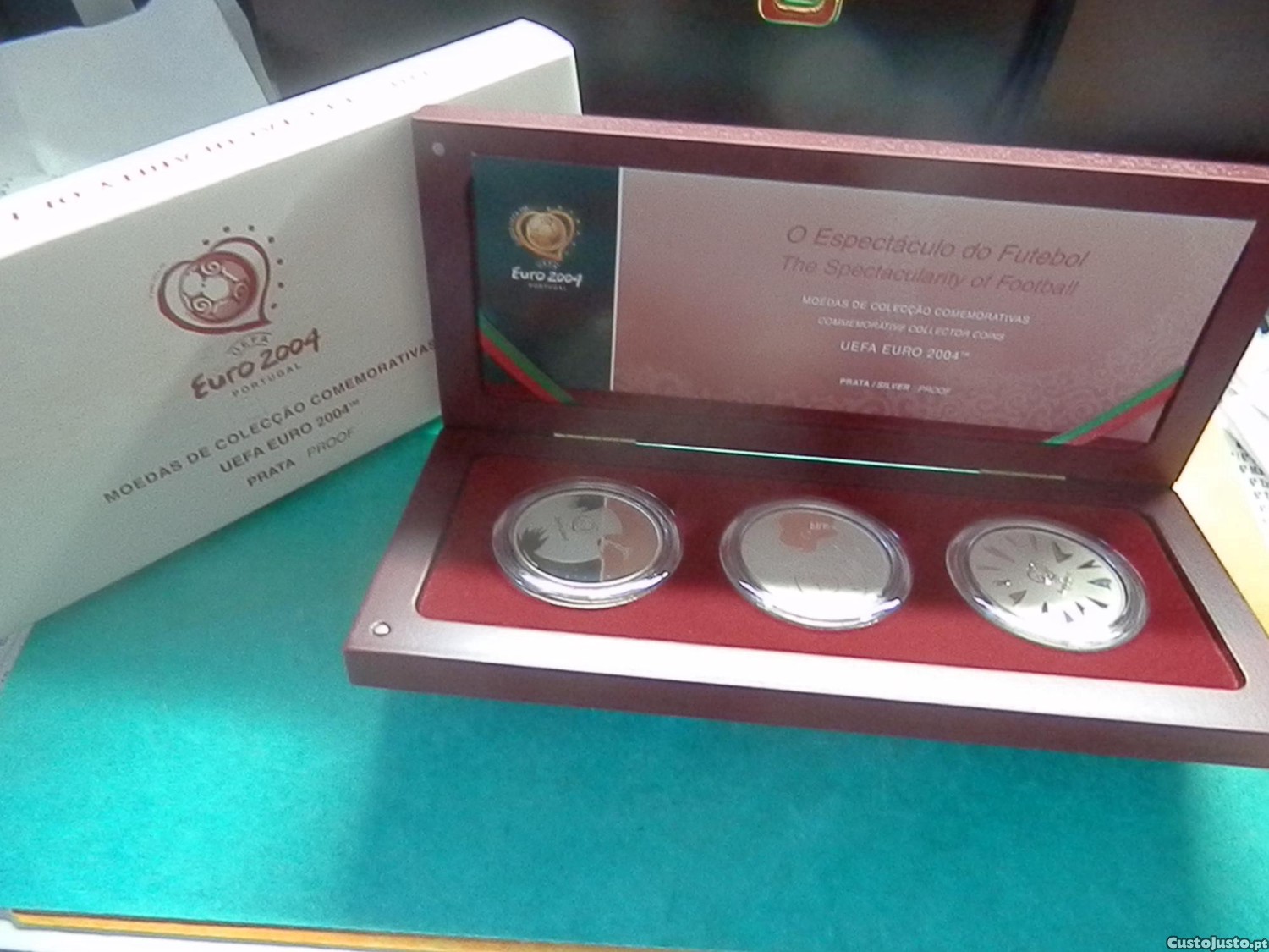 - PROOF: Estojo completo com 3 moedas 2003 de 8,00 euros prata proof 31,50 gramas cada (925/1000), Certificado e cinta exterior, alusiva a "O Espectáculo do Futebol UEFA - Euro 2004". Cada moeda representa: