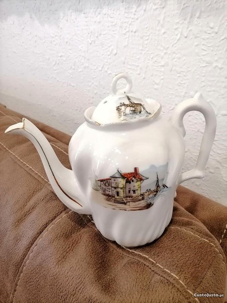 Peça de coleção, Bule Vista Alegre c/tampa correta, decoração policromada com paisagens e frisos dourados. Marca da Vista Alegre verde grande fogo e carimbo em uso entre (1881 a 1921), denominado de símbolo Cegonha, ainda marcado na pasta com o n. 15.