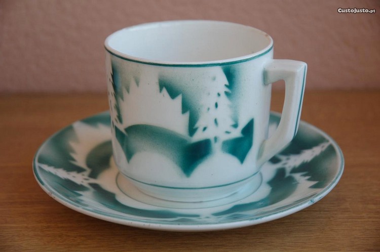 Lindo conjunto invulgar muito antigo duma chávena e pires com motivo pinheiros verdes da antiga fábrica de Massarelos Porto Portugal.