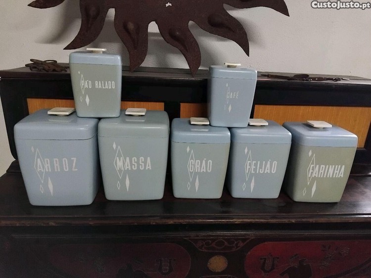 Um conjunto de frascos ou caixas em baquelite de se colocar mercearias, estao em bom estado
