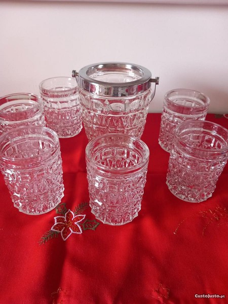Conjunto antigo de 6 copos de whisky e balde para o gelo em vidro grosso com relevos.