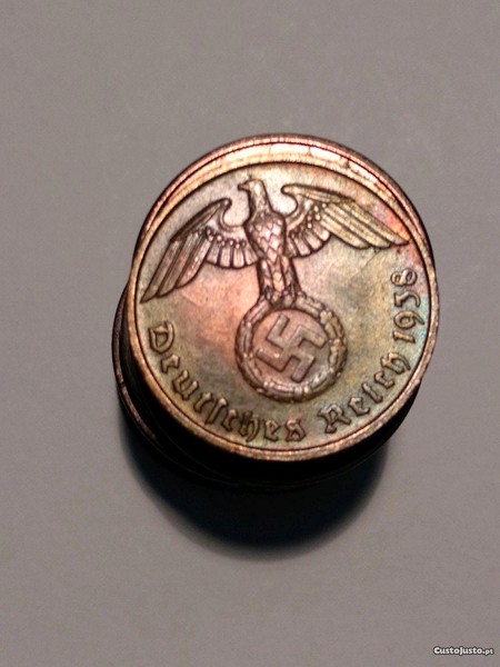 Moedas de 2 Reichspfennig 1938 Alemanha com suástica nazi, muito bem conservadas a 3,00 euros cada.