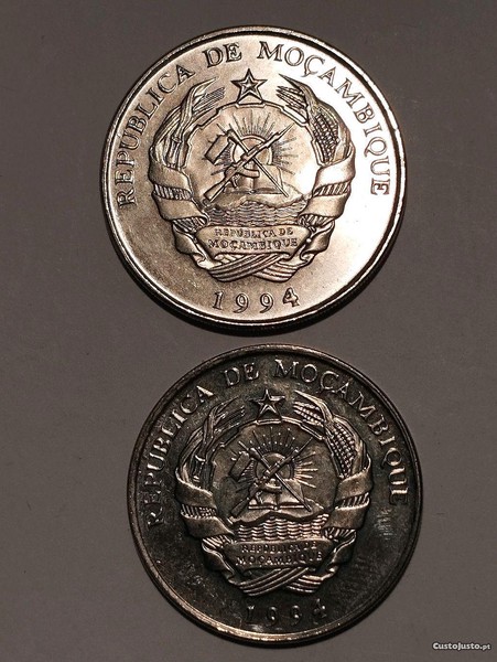 Moedas de 1000 e 500 Meticais 1994, não circuladas a 3,00 euros cada.