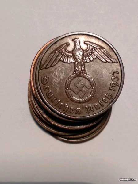 Moedas de 10 Reichspfennig 1937 com suástica nazi, em Cobre, muito bem conservadas a 3,00 euros cada