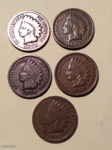 Moedas Indian Head Cent 1893, 1895, 1896 e 1897 dos Estados Unidos da América, circuladas a 3,00 euros cada.