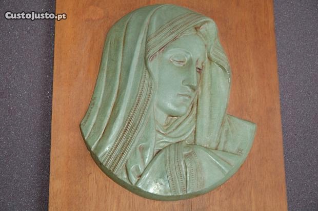 Bonita placa da Nossa Senhora em marfinite pintada verde com assinatura:"Escudero" "R.C." Dimensões : 25 cm x 18 cm. Peso : 590 g. Encontra-se em Leiria(m ais portes CTT se necessário).