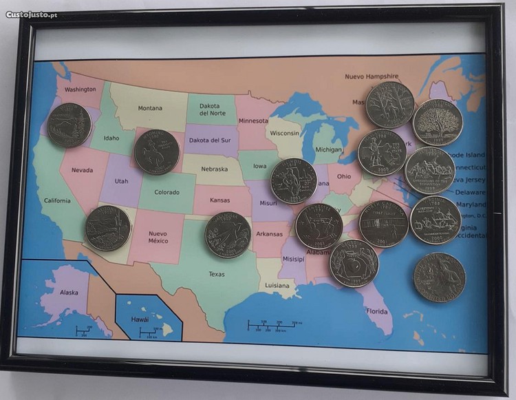 Com 14 moedas 1/4 Dollar representativas de alguns Estados Americanos, moedas correntes verdadeiras de elevado valor Numismatico