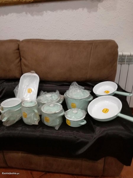 Trem de cozinha esmaltado de cor verde clara por fora e branca por dentro da marca "Águia" da extinta e emblemática empresa "Metalúrgica Duarte Ferreira SARL" cujo museu foi considerado o melhor no ano de 2018, nunca usado, ainda embalado em estado irrepreensível composto por 10 peças: