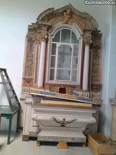 Um altar de capela privada em madeira e bastante antigo e precisa de algum restauro. Falta algumas pecas de madeira. Tem de altura cerca de 5 metros