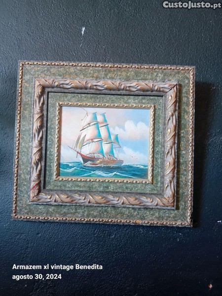Um quadro pintado a mao com o tema mar gaivotas e barco, esta em bom eatado e mede 48 cm por 44 cm