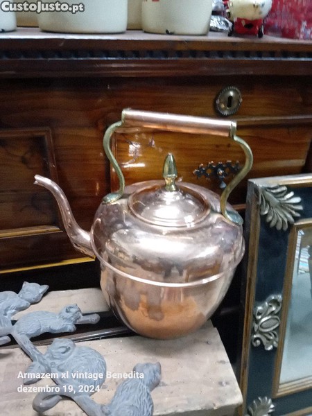 Uma chaleira em cobre recente da para usar. Nunca usada esta como nova. Mede de altura total 30 cm