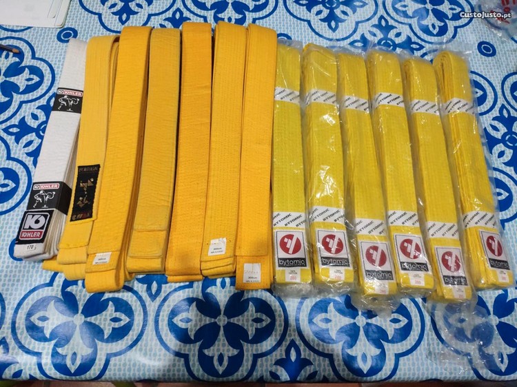 Cintos artes marciais judo karaté taekwondo kickboxing. Branco - Kohler para 170cm de altura. Não sei o comprimento do cinto pois é novo não o quis abrir. 4eur Amarelo - usados, não coube a foto, 280cm e 260cm. 2.5eur cada - NOVOS: 4 sem marca, 300cm. 5eur cada - NOVOS: 6 Bytomic, 280cm. 5eur cada Laranja - NOVOS: 2 Kohler, 300cm. 6eur cada - NOVO: 1 Kohler, 240cm. 4.5eur - usados: 2 de 270: 1 de marca portuguesa 2.5eur (claro) e outro sem marca. 3.5eur - usado: 280 sem marca. 3.5eur Verde - NOVO: Kohler, 300cm. 6eur. - usado: 270, marca portuguesa. 2.50eur. Azul - NOVOS: 4 Kohler 300cm. 6eur - usado: 2 Kohler em excelente estado 280. 5eur - usado: Tochi Gi, 280cm. 2.5eur - usado: Suteki, 260cm. 2.50eur Azul castanho - NOVOS 6eur cada 8 Dragon, 280cm 1 Dragon, 260cm 1 Dragon, 240cm Castanho - NOVO. Kohler, 300cm. 6eur Desconto de 25% para quem comprar o conjunto. Envios à cobrança mediante pagamento antecipado dos portes.