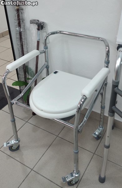 Cadeira de banho indicada para pessoas com mobilidade reduzida, como um auxílio na realização das atividades sanitárias. Cadeira com estrutura revestida em aço cromado, com aparadeira sob o assento. Ajustável em altura, com quatro rodas todas elas com travões. Dobrável para transporte ou armazenamento.
