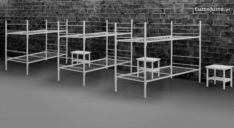Cama Prumos da testeira e peseira em tubo quadrado 30x1,5mm, travessas tubo quadrado de 20mm, vigas do estrado 35x20x1,5mm e sendo a rede do estrado de aço de 4mm electro soldada com qualidade para ficar solida ao solo. Pintura epoxy cinza ou preto +iva, Colchão p/ Cama Beliche 1830mm Espuma de Alta Densidade 35E, Cama metálica, Cama ferro, Cama para obra, Cama para estaleiro, Cama desmontável, Beliche com duas camas, Cama robusta, Cama para funcionário de obras, Cama para peregrinos, Cama auxiliar dormitórios, Cama solteiro, Cama com qualidade.