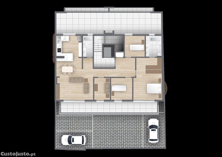 Constituído por hall de entrada, sala com cozinha equipada em open space, 2 quartos, 1 suite, 1 escritório e 1 casa de banho. Para além de uma generosa varanda, o apartamento conta com um fantástico terraço de utilização exclusiva, com cerca de 40 m2. Possui ainda 2 lugares exteriores de estacionamento e 1 espaço para arrumos no piso 0.