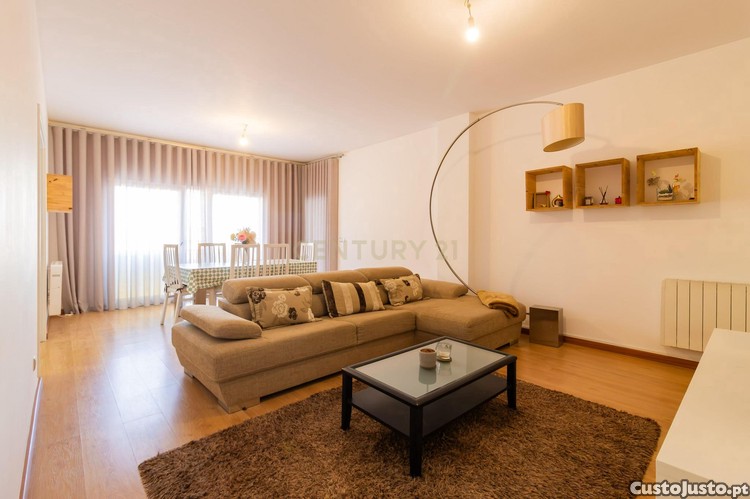 O apartamento é composto por uma sala de estar e jantar luminosa, uma cozinha equipada com eletrodomésticos modernos, e três quartos, incluindo uma suite com casa de banho privativa. Com 2 casas de banho, varanda e garagem, este espaço é ideal para quem procura conforto e funcionalidade. As janelas de vidro duplo e o isolamento acústico garantem tranquilidade e privacidade.