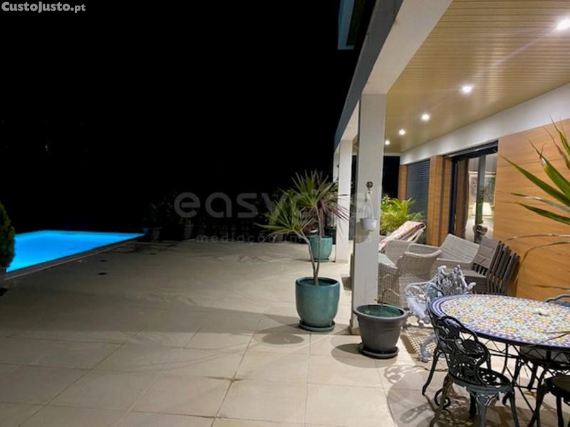 A moradia inclui duas suítes, mais dois quartos com roupeiros, escritório, várias casas de banho e zonas sociais luminosas. No exterior, destaca-se a piscina aquecida, rodeada por vegetação que garante total privacidade, e espaços amplos de lazer com vista panorâmica.