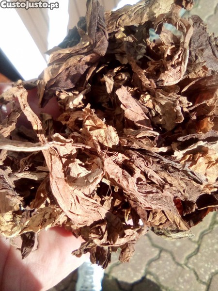 Folhas para cacilhar, virginia, e sem o talo principal. Deixei de fumar e esqueci-me deste bocado de folhas durante 1 ano e meio. Estão um pouco secas, mas podemos voltar a pôr a humidade necessária. Deve ser perto de 1 kg mas ponho o preço de 500g. Já não uso mas custou-me tanto a adquirir que gostava que não fosse desperdiçado.