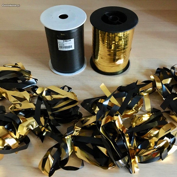 Dois rolos novos de fita e 30 laços de fita em preto e dourado.