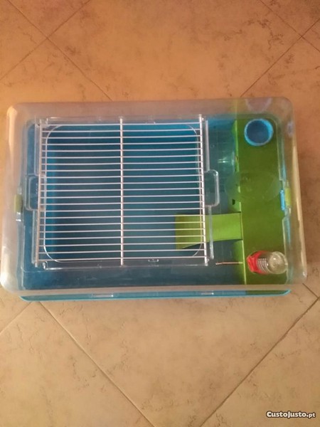 Gaiola completa com roda para Hamster fundo azul e casota verde com abertura de grade por cima