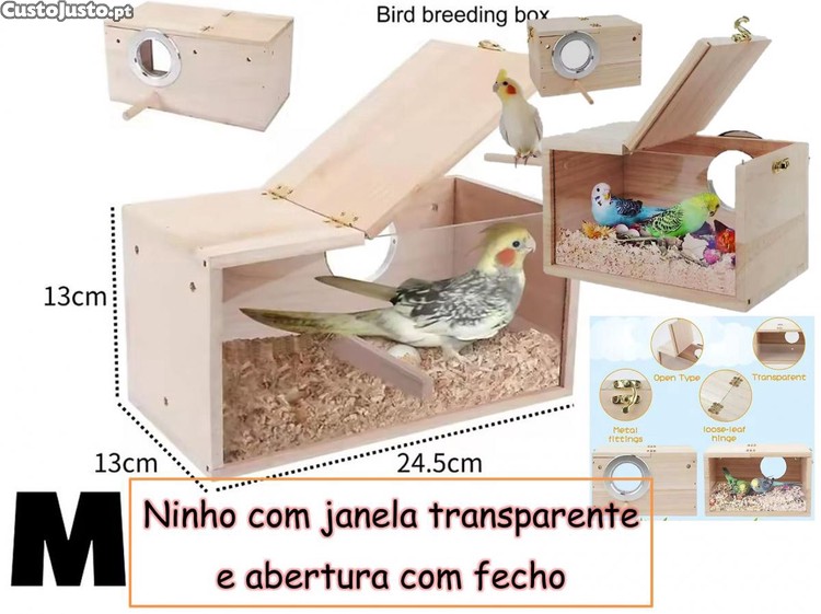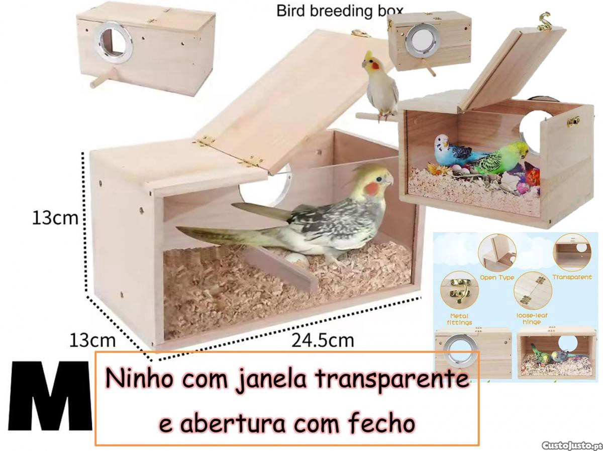 Ninho com janela grande em acrílico, ideal para seguir o processo dos ovos e acompanhar as crias, sem incomodar os pais.