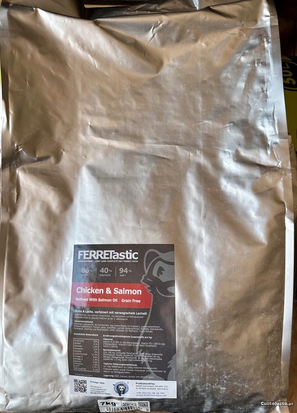 Com o nosso Ferret4You FERRETastic! V2.0 oferecemos um alimento seco para furões que satisfaz os nossos elevados padrões para uma dieta saudável de furões. O nosso FERRETastic V2.0 é um alimento completo para furões reduzido a duas fontes de proteínas, baseado na combinação de frango saboroso e salmão de alta qualidade. Frango de alta qualidade e salmão fresco são os principais componentes dos fornecedores de energia. Apenas utilizamos ingredientes aprovados para consumo humano nos nossos produtos. Tal como nos nossos outros produtos, utilizamos apenas conservantes naturais à base de vitaminas e evitamos completamente corantes artificiais, sabores ou mesmo açúcar.