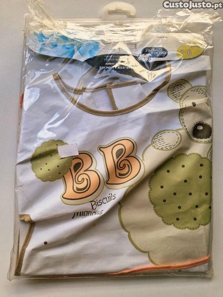 Novo, nunca usado, ainda na embalagem. Bibe com mangas em plástico translúcido para mais de 9 meses.