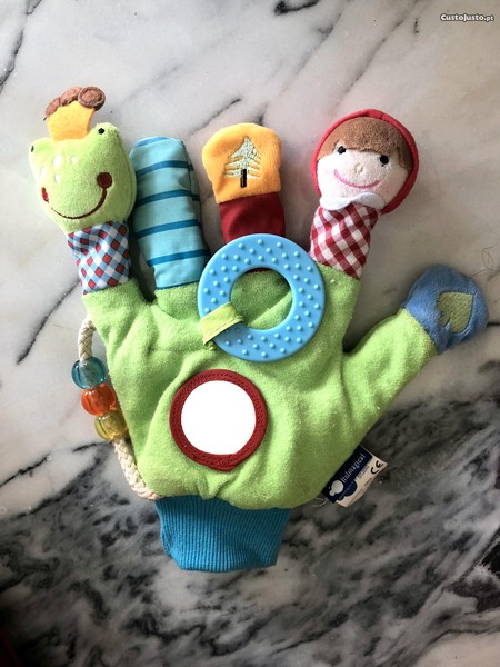 Boneco de tecido de luva com 5 dedos, 2 dos quais são personagens. Inclui ainda um cordão com 3 mordedores coloridos móveis e um espelho inquebrável com moldura de mordedor.