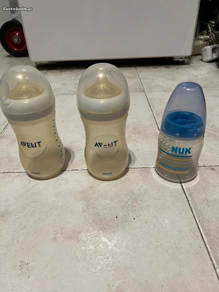 Vendo conjunto de dois biberões + garrafa para guardar leite + dois copos de transição para água, usados.
