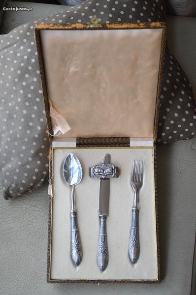 Conjunto de talheres de criança antigos em prata: colher, faca, garfo com cabos entalhados e argola para guardanapo trabalhada. Medida aprox. 18 cm cada peça (exceto argola). Necessitam limpeza. Estojo original, antigo.