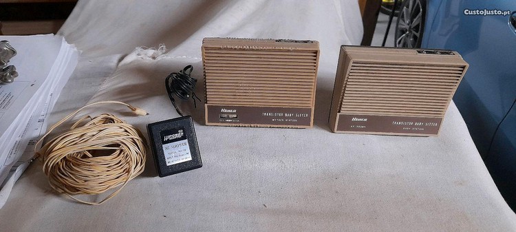 Tramsmissor baby sitter antiquissimo de fio transmissor três canais a funcionar marca Homer.Com adaptador original da marca, nunca falha...cabo com 15 metros.