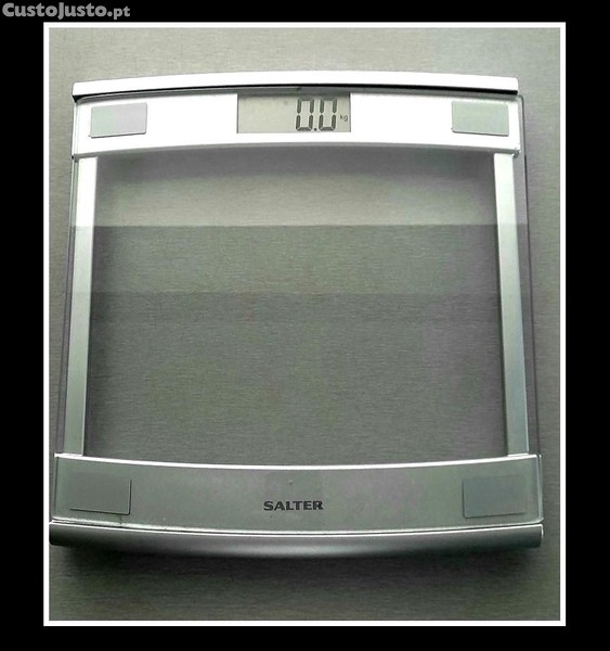 Balança Digital WC, 'Salter', em cinza prateado, base em vidro, máx. 180Kg, pilhas incluídas, C36 x L38 x A7cm, excelente estado.