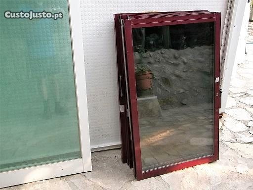 Janelas e porta em alumínio grená, de correr e com vidro duplo fumado, com aros e prontas a montar, tudo em bom estado.