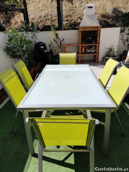 Preço: 150 €Mesa de jardim/terraço em bom estado, estrutura em alumínio e com tampo de vidro