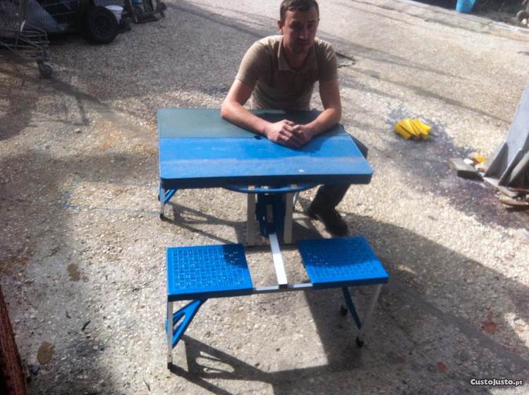 Vendo mesa de piquenique de qualidade alemã de cor azul onde vem tudo dentro de um estojo onde é só abrir tem pequeno órificio no meio onde se pode meter guarda sol ou chuva.