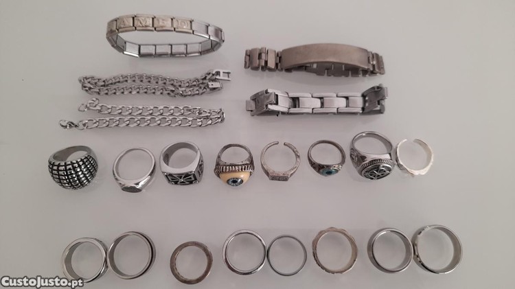 Anéis e fios em aço 19 -fios em aço 5- Pulseiras 8- Alianças 8 - Anéis 2 Caveiras para fios A maioria novos Fios, Pulseiras, Alianças, Anéis tudo em aço (Agradecia respostas às vendas que fosse por E-Mail (Ou Telemóvel Só vendo por transferência bancaria o paga os portes e paga restante quando receber a encomenda. Só faço vendas a dinheiro Transporte a cargo do comprador (Não Faço vendas por MB Way) Portes a cargo do comprado Veja também meus outros Anúncios Obrigados Agradecia se podem dar uma Classificação aos meus anúncios