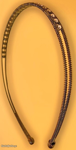 É de óptima qualidade, toda em metal preto, com aro duplo e ambos com um fio metálico como que em espiral em redor dos aros principais. Esta bandolete é em metal maleável, abrindo e fechando consoante o necessário para melhor se adaptar à cabeça do seu utilizador, ajustando-se na perfeição. Em todo o redor, de meio para cima, encontra-se cravada com 25 brilhantes de cristal, o que lhe confere um aspecto muito sofisticado, um dos brilhantes encontra-se em falta, conforme foto anexa, no entanto, este pode ser recolocado em oficina própria para o efeito. É muito invulgar e original e um excelente complemento a uma toilette requintada.