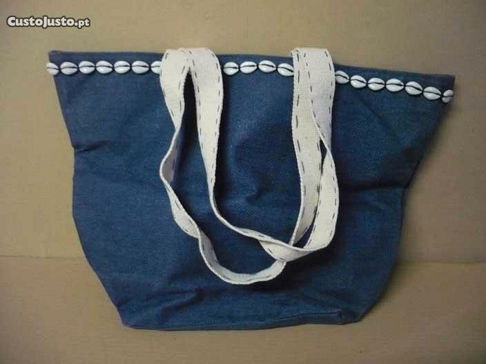 Mala ou bolsa para tempo de praia, feita de tecido muito forte e impermeável tipo juta. De cor azul e ornamentada com conchas, mede cerca de 40 cm por 40 cm. Tem uma pequena bolsa interior. Está nova, nunca foi usada. Barata para desocupar. Negociável, vendo pela melhor oferta.