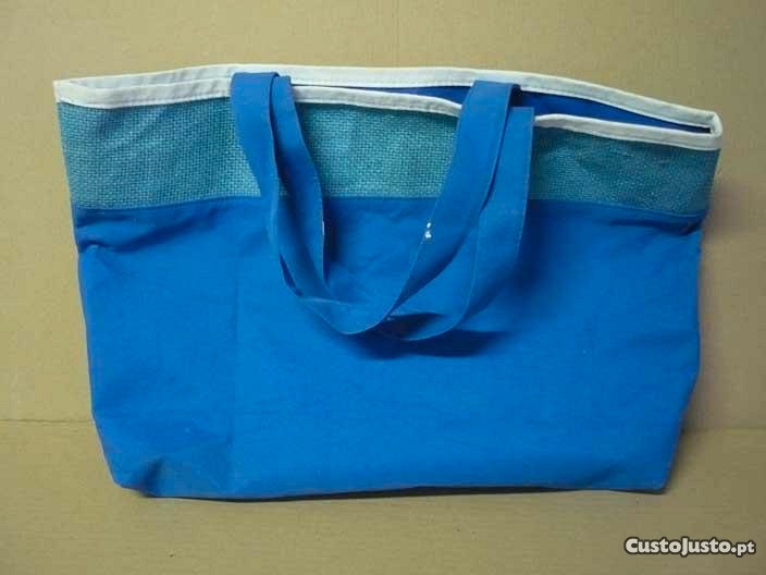 Mala ou bolsa para usar em tempo de praia, feita com dois tipos de tecidos, juta e pano cru. Tem forro e as cores dos tecidos são todas em tonalidades de azul. Mede cerca de 40 cm por 40 cm e está nova, nunca foi usada. Barata para desocupar. Negociável, vendo pela melhor oferta.