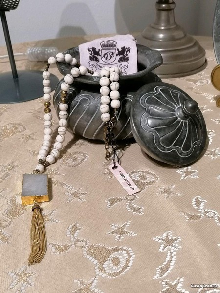 Bonito e elegante colar de contas da conhecida Casa Batalha, com pingente em pedra Ágata com forma retangular 28-40 mm revestida a dourado.