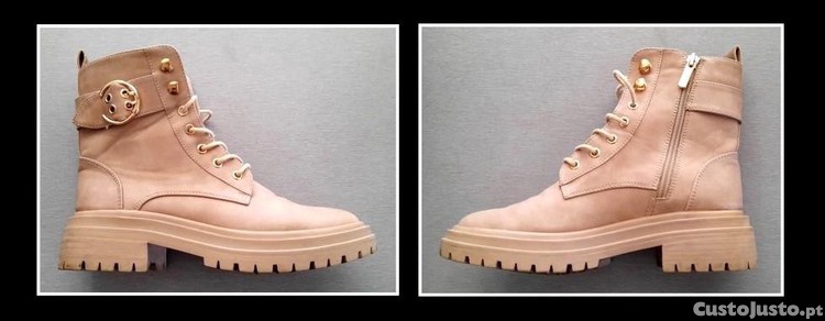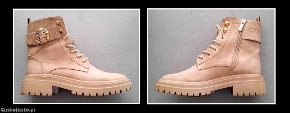 Botas de Montanha, n.º 36, 'Seaside', novas, em bege, com atacadores, fecho lateral dourado, sola em borracha, ferragens em dourado, excelente estado.