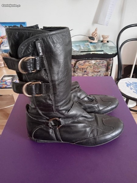 Botas de senhora 39 Mustang pretas de meio cano com fecho éclair e duas fivelas de lado. Muito confortáveis e maleáveis. Apresentam um gasto ligeiro nas biqueiras, daí o preço mais em conta.