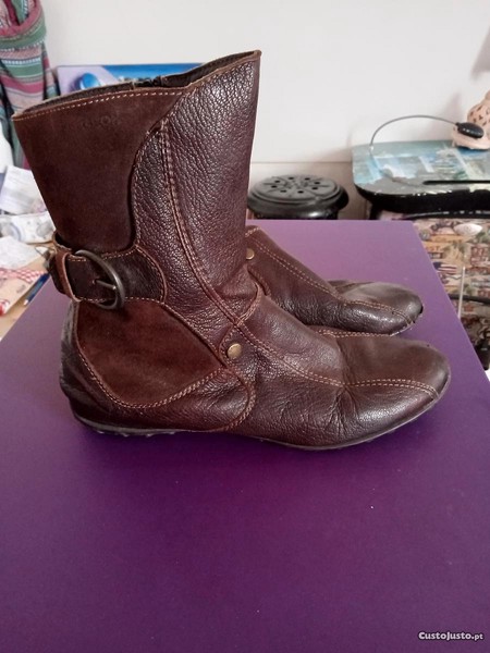 Botas Geox de cano curto, castanhas em pele e couro com fecho éclair e uma do lado contrário. Confortáveis e maleáveis.